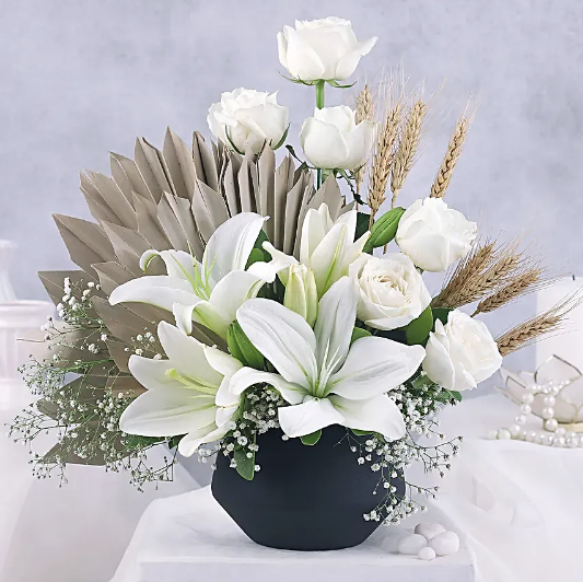 Product contains, 6 stems of white roses, 2 stem of lilies and golden leaves in black pot.