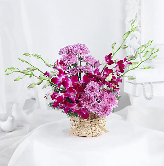 Elevate your home decor with our Orchid Majesty Basket, featuring vibrant and elegant orchids. These stunning flowers add a touch of luxury and sophistication to any room. Expertly arranged, our basket is the perfect addition to your living space. Enjoy the beauty and benefits of live orchids.